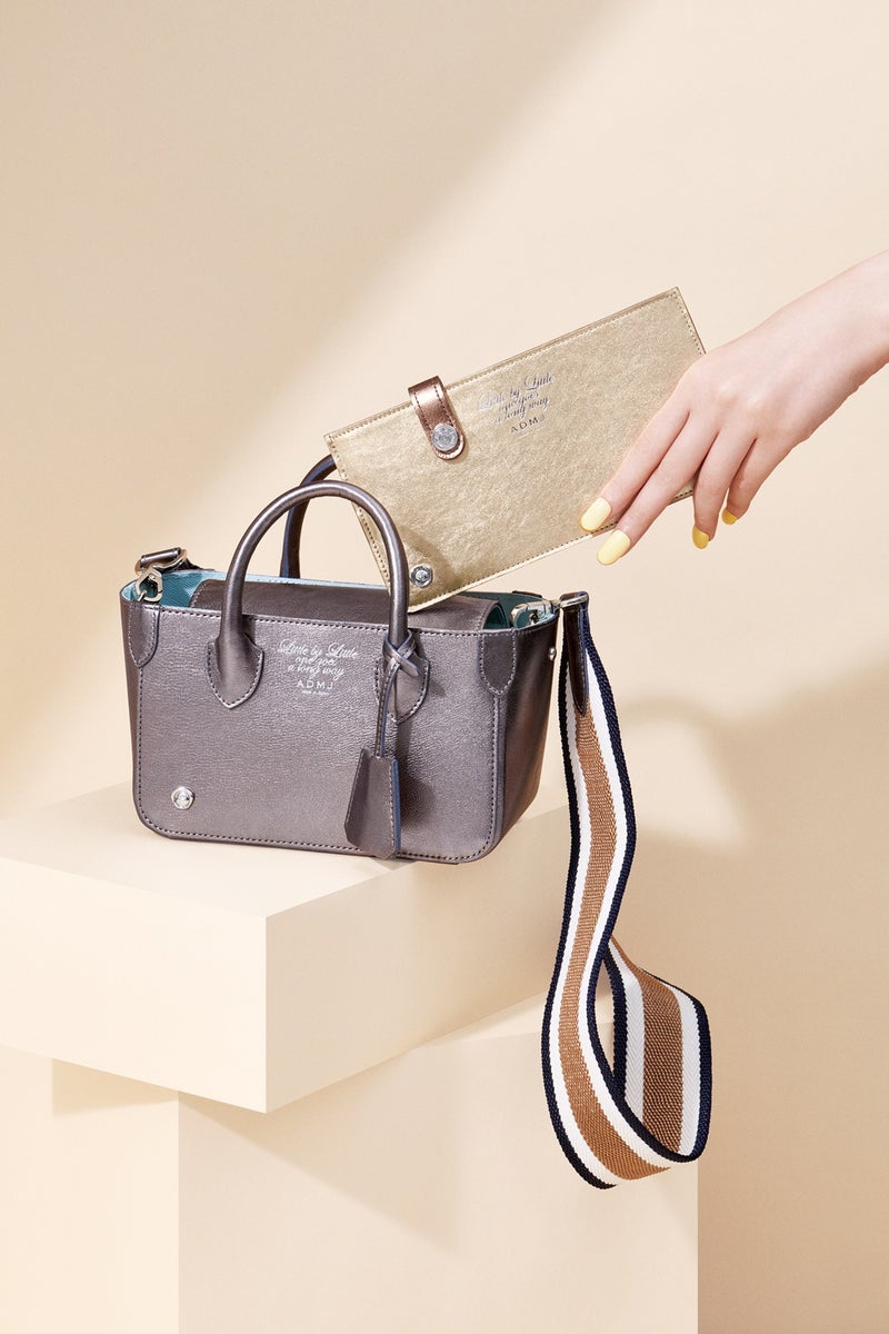 箔押しの「Little by Little one goes a long way(千里の道も一歩から)」というレタリングには、ひとつひとつの素材・パーツの良さを見極め、丁寧に作業を積み重ねてきた、A.D.M.J.らしいメッセージを込めています。