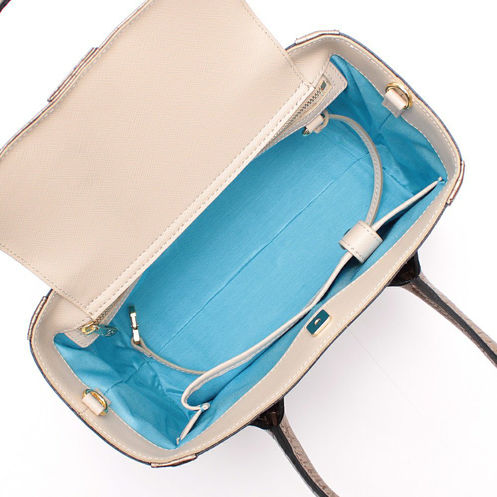 内側:メイン1室、ポケット3個(オープン1個、スナップボタン付1個、ファスナー付1個)、キーストラップ、両サイドにストラップ用D管