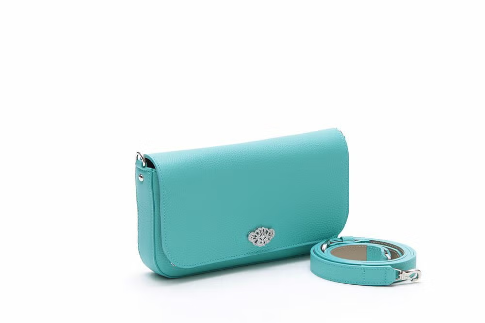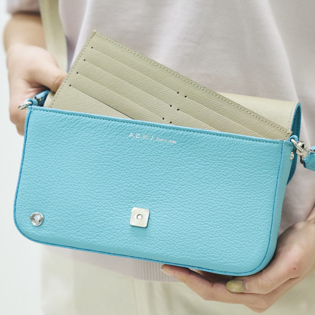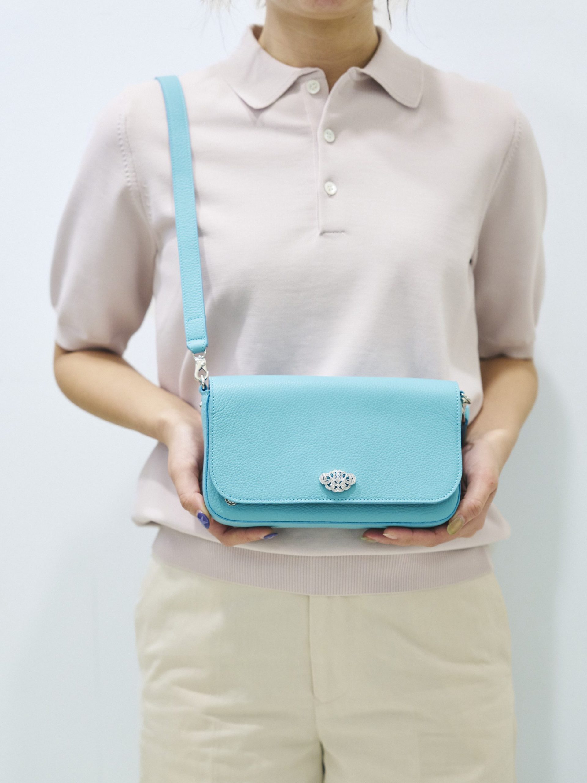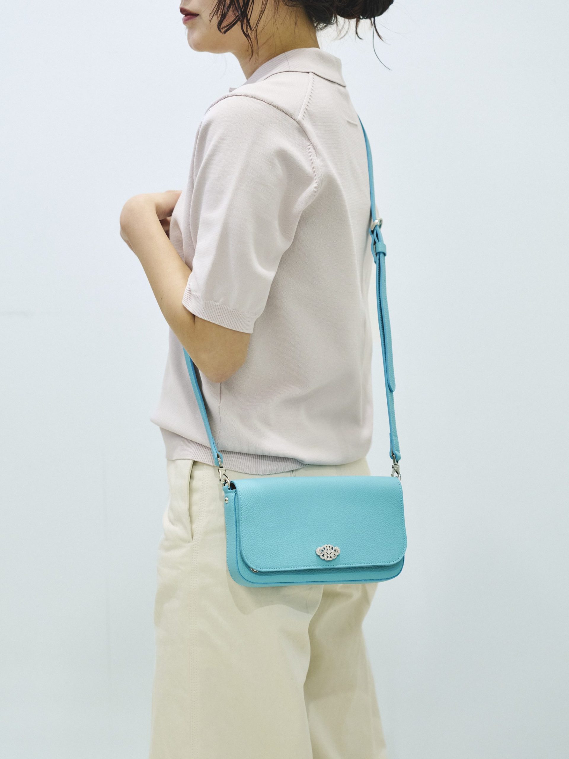 鮮やかなターコイズブルーが印象的なこちらのバッグ。